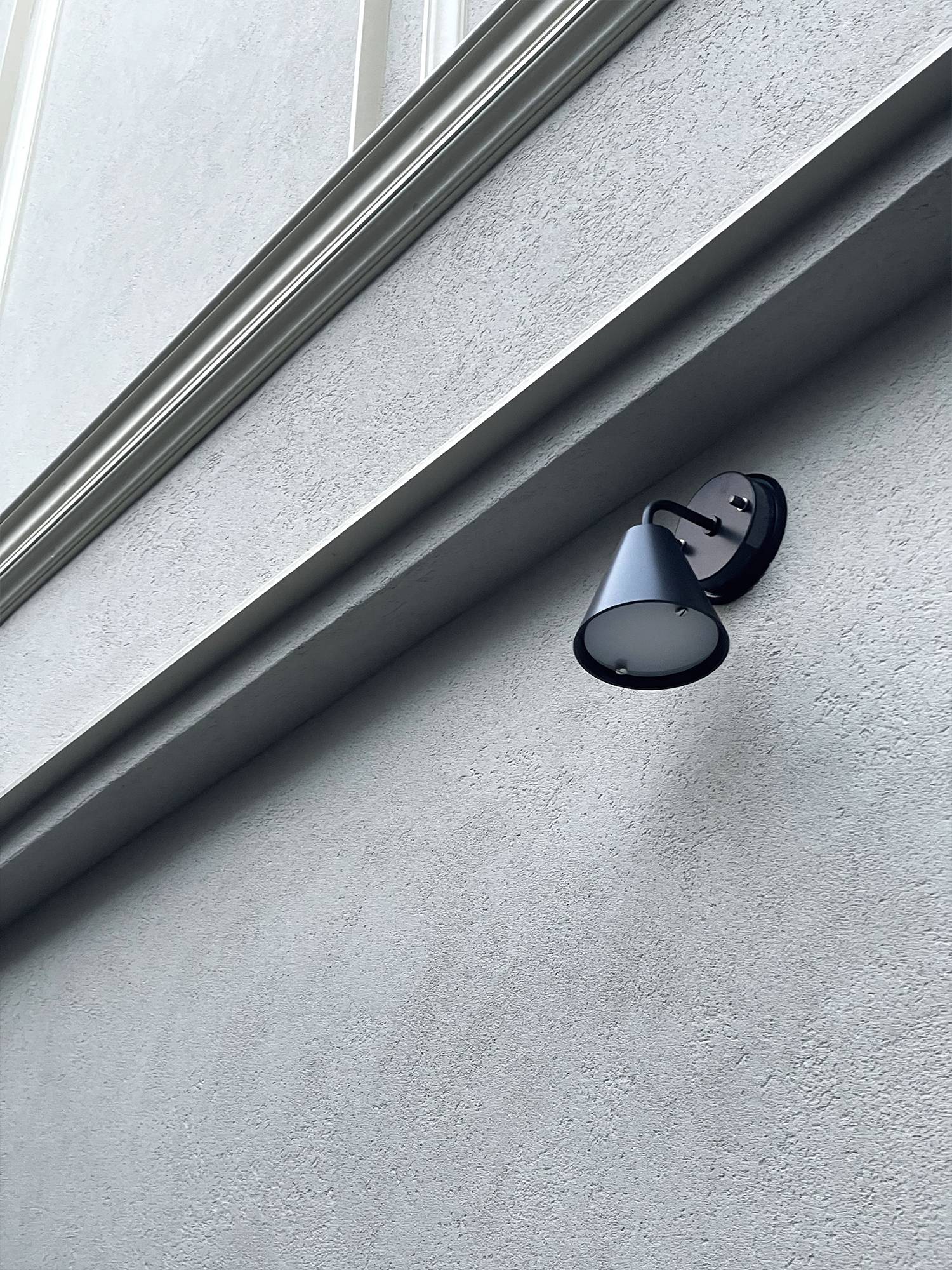 計算された外壁照明が建物の輪郭をやわらかく浮かび上がらせ、上質で洗練された印象を際立たせます。